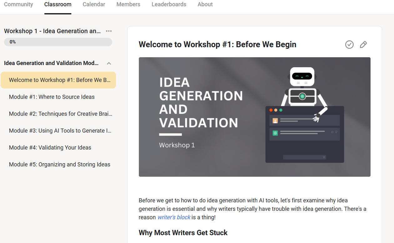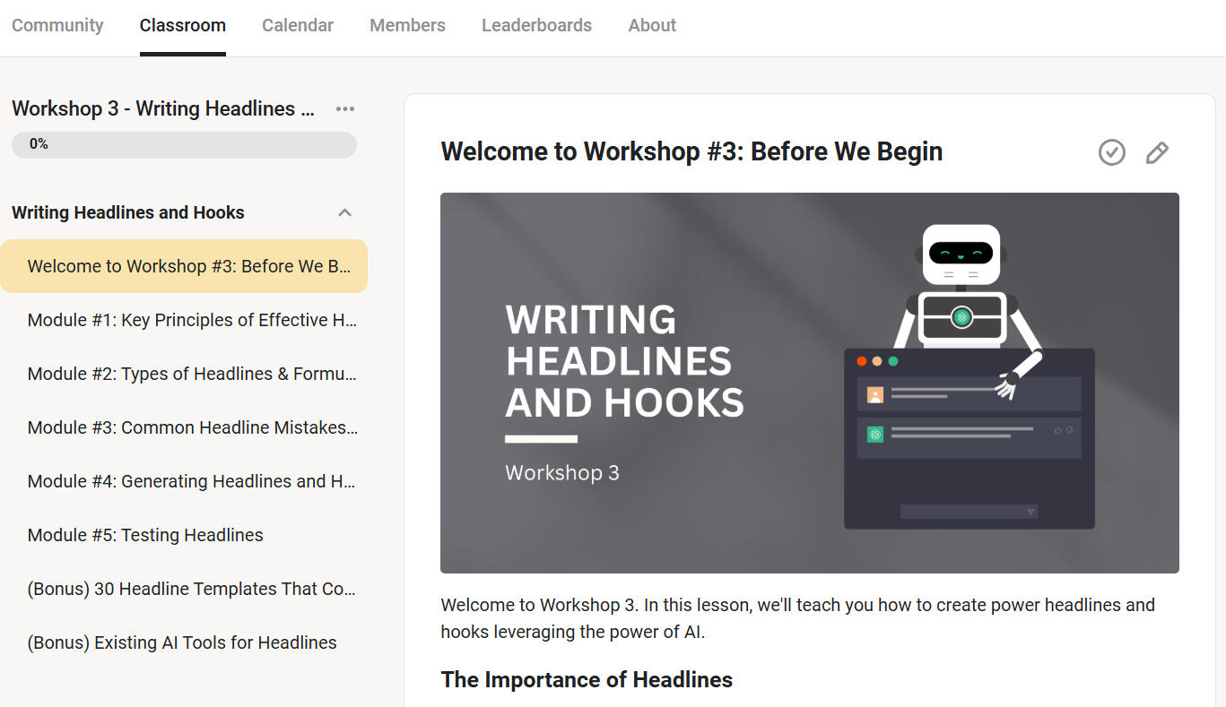 Writing With AI is a series of 6 online workshops which are hosted in our Writing With AI Skool group.And as soon as you join, you will get instant LIFETIME access to all of them.Here’s a quick rundown of everything you will find inside each workshop (and how they help you leverage AI to write better):