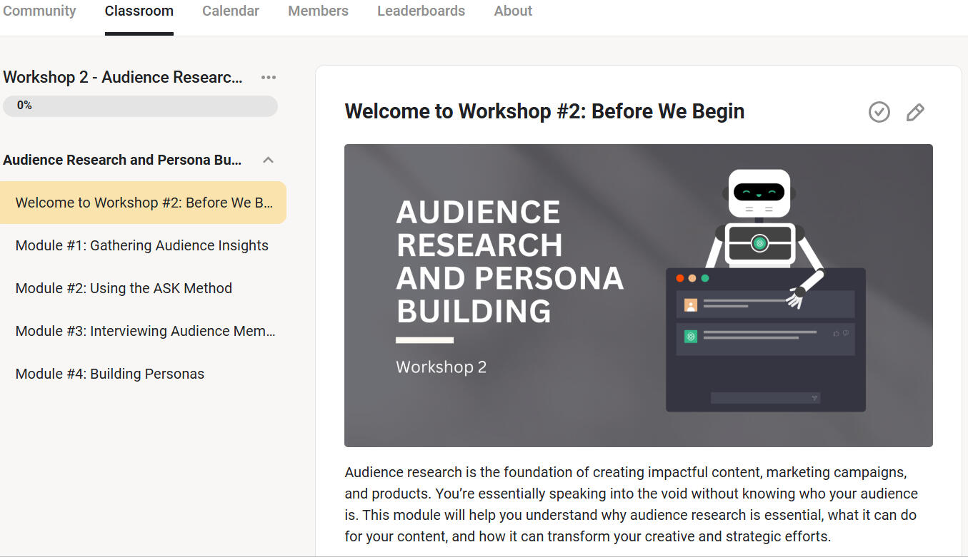 Interviewing Audience Members: Sometimes, the best insights come directly from the source. Learn how to find people to interview, what questions to ask, and how to use AI to craft effective interview prompts. This module helps you tap into the minds of your audience for invaluable feedback and inspiration.